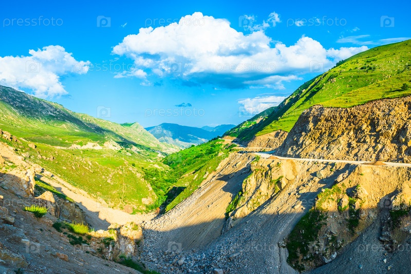 Горный каньон с скалистыми склонами и дорогой, строящейся в горах Северного Кавказа