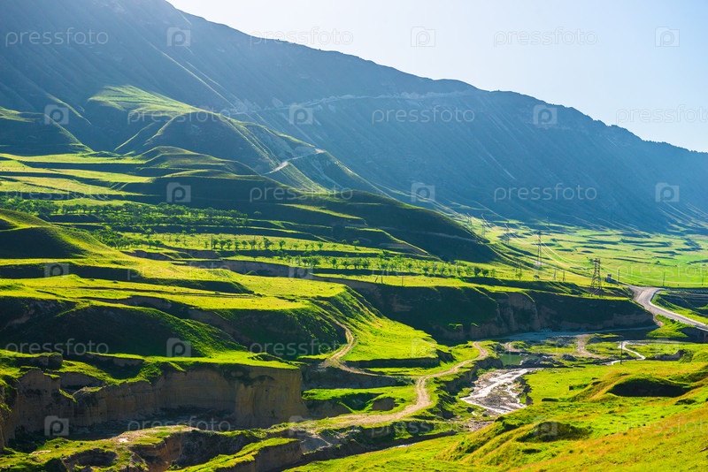 Красивый горный пейзаж извилистой горной реки среди террас геологических отложений в горах Северного Кавказа