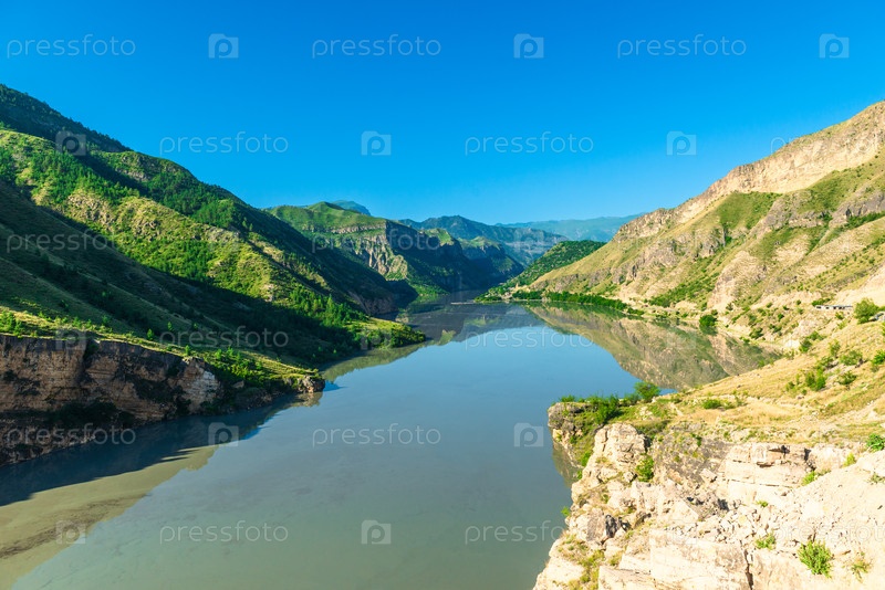 Живописный пейзаж горного озера в солнечную погоду в горах Северного Кавказа
