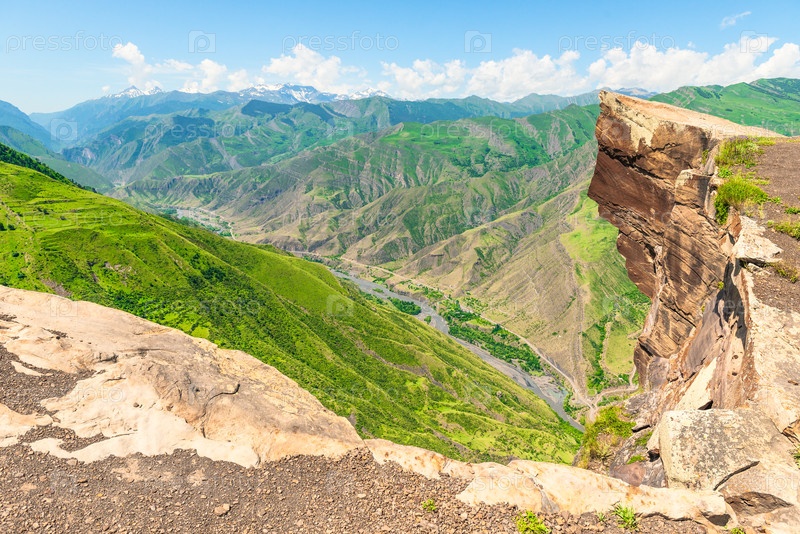 Прекрасный вид на плоскую длинную скалу 'Язык горного тролля' над пропастью глубокого горного ущелья Северного Кавказа