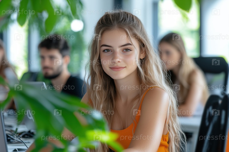 Портрет красивой молодой женщины, сидящей за столом в офисе