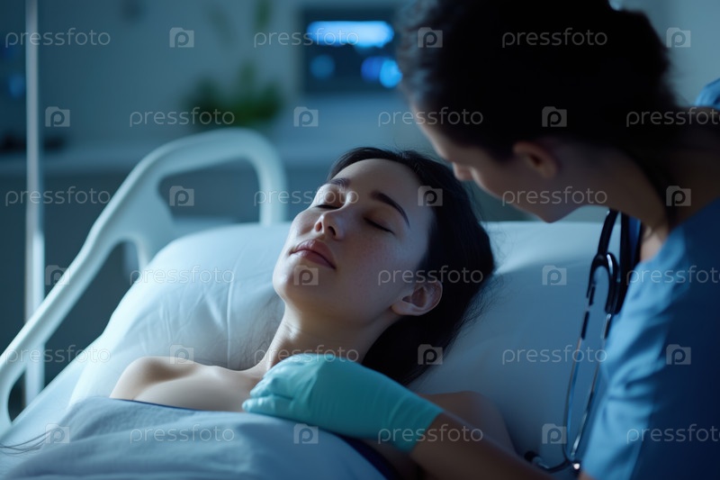 Молодая женщина лежит в больничной постели, пока врач осматривает ее