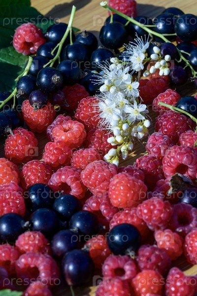 Свежие малины и черная смородина на деревянном столе