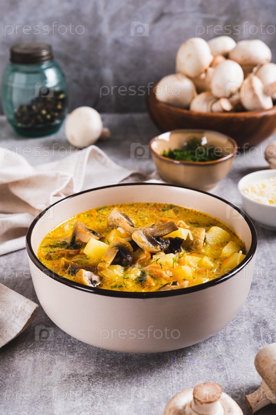Вкусный суп с овощами, грибами и сыром в миске на столе вертикальный вид