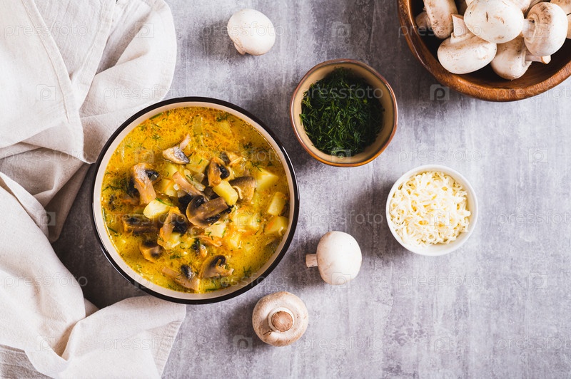 Вкусный суп с овощами, грибами и сыром в миске на столе наверху
