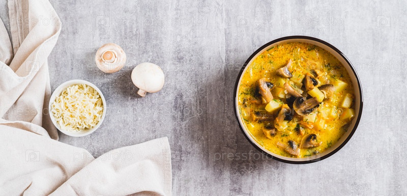 Сырный грибный суп с травами в миске на столе с просмотром веб-баннера
