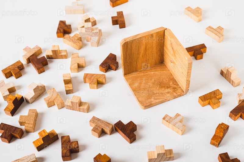 Деревянная коробка и различные кусочки головоломки на светлом фоне