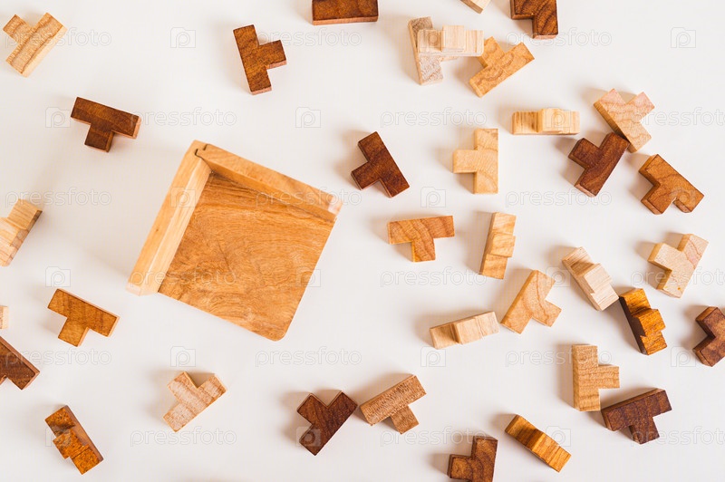 Деревянные головоломки и пустая коллекционная коробка на светлом фоне