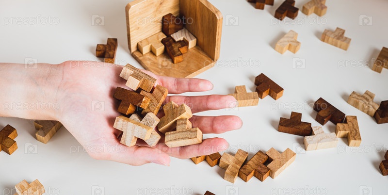 Женская рука держит деревянные головоломки для отдыха, думая о веб-баннере