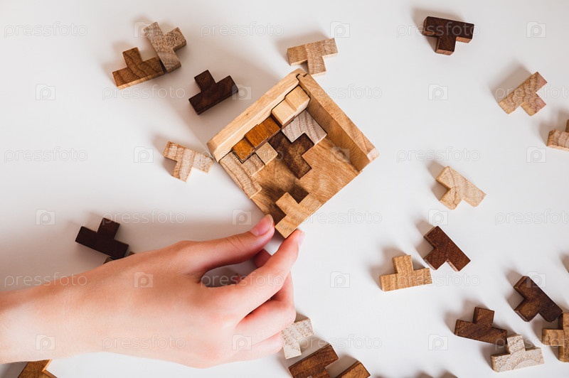 Женская рука помещает деревянный кусок головоломки в коробку с видом на стол