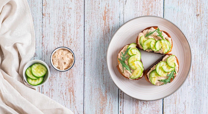Домашний тост с рыбьей печенью, огурцом и травами на тарелке на веб-баннере с видом на стол