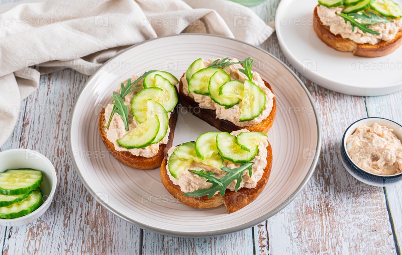 Апетитные бутерброды с паштетом из рыбьей печени, огурцом и ругулой на табличном веб-баннере