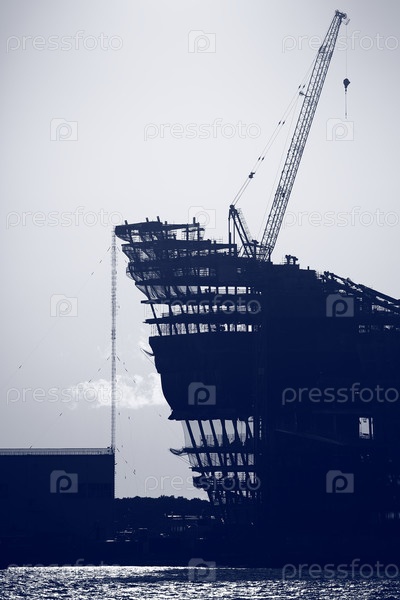 Вид на строящееся здание и строительный кран в бухте. чёрно-белое фото