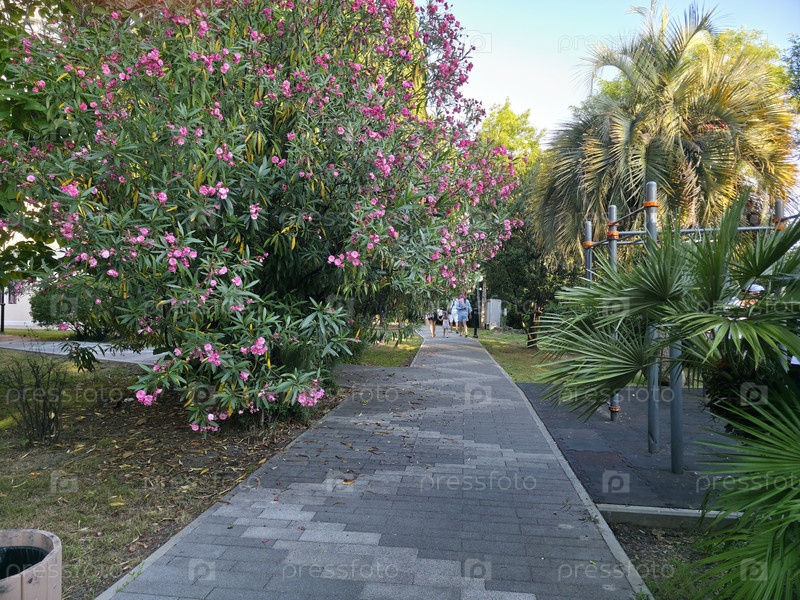 Уютная улица Сочи: олеандеры, отдыхающие и атмосфера курорта