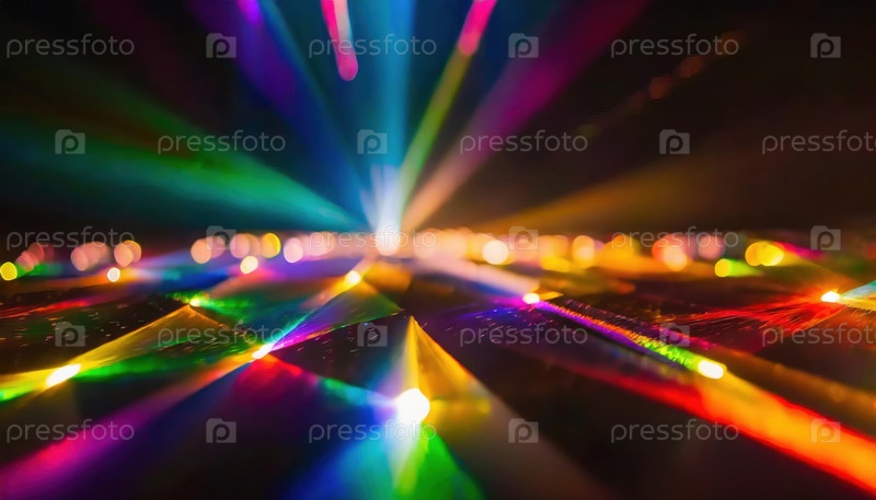 Абстрактные лучи красочного света рассеиваются и отражаются на темной поверхности в ярком световом дисплее