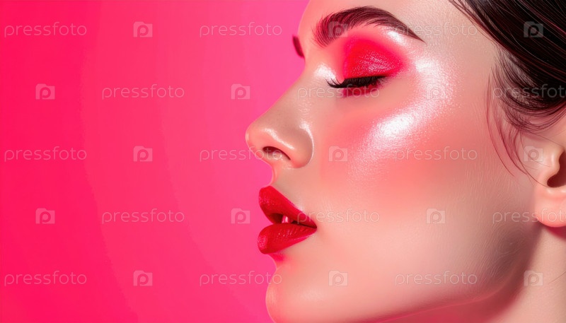 Близкий снимок женщины с смелым блестящим красным макияжем и мерцающим подсветом на розовом фоне
