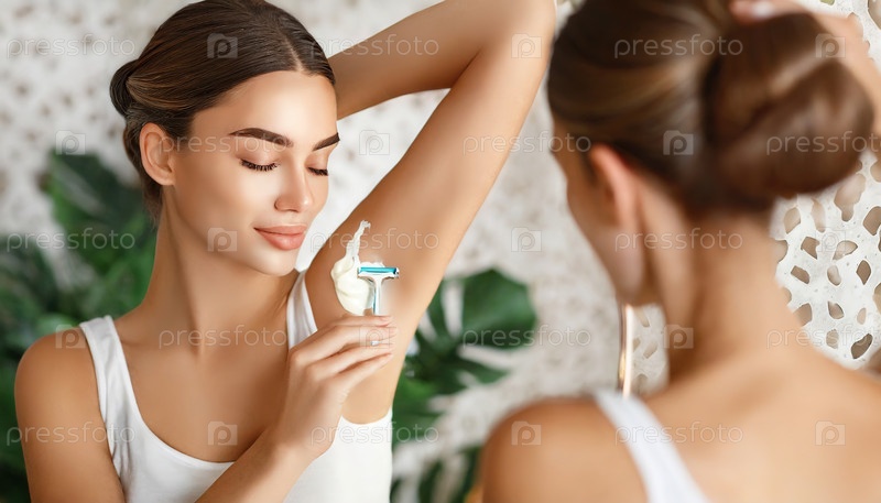Женщина брит свои подмышки перед зеркалом с кремом и бритвой в яркой ванной