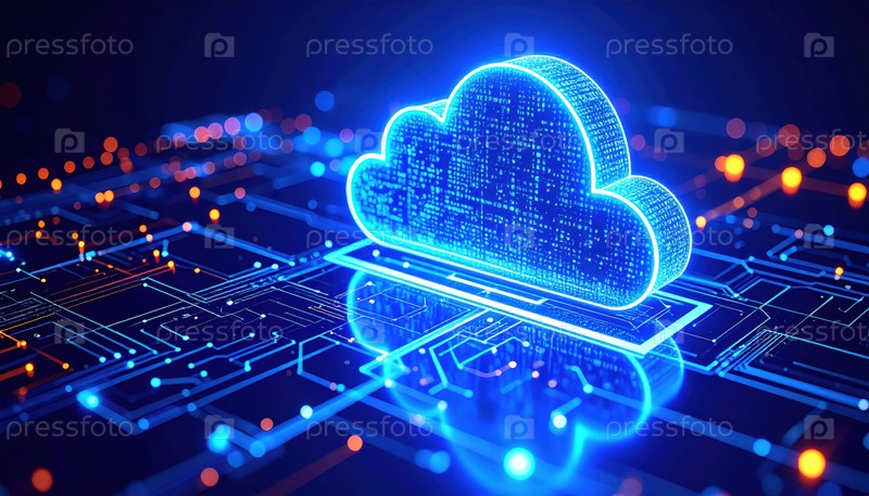 Светящееся неоновое облако над печатной платой, символизирующее облачные вычисления, сети обработки данных, цифровую инфраструктуру и футуристические технологические тенденции