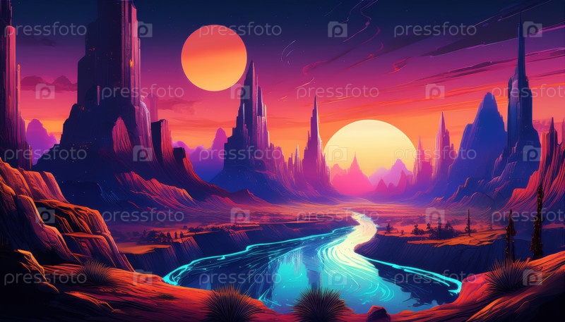 Сюрреалистический инопланетный пейзаж с двумя солнцами и светящейся рекой передает темы исследования, внеземной красоты и космического воображения
