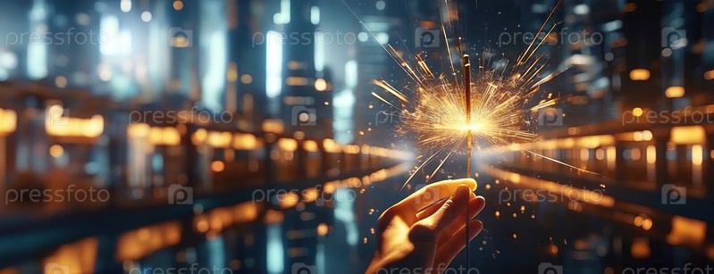 Рука, держащая зажженную искру на фоне размытых городских огней с бокехом, вызывая чувство празднования и городской ночной жизни. Современный центр города ночью. Празднование Нового года