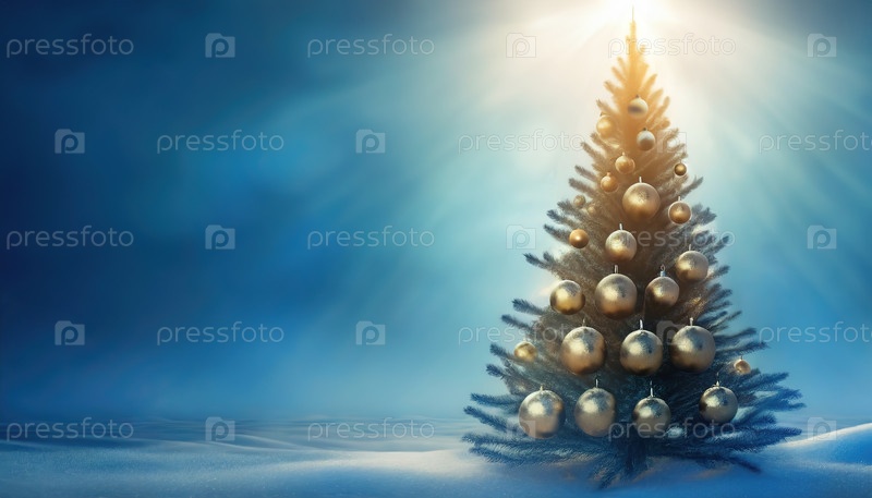 Рождественская елка, украшенная золотыми драгоценностями и светящимися огнями в снежной зимней стране чудес, создает волшебную атмосферу праздника