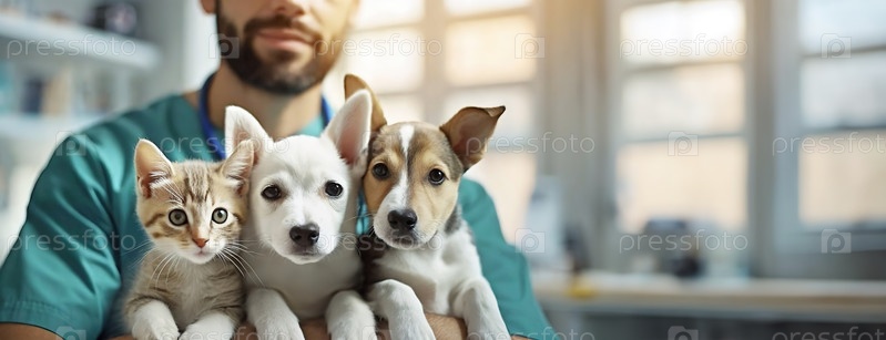 Профессионал-ветеринар держит в руках котенка и двух щенков, с размытым фоном. Доктор ветеринарной клиники с животными. Панорама с копировальным пространством