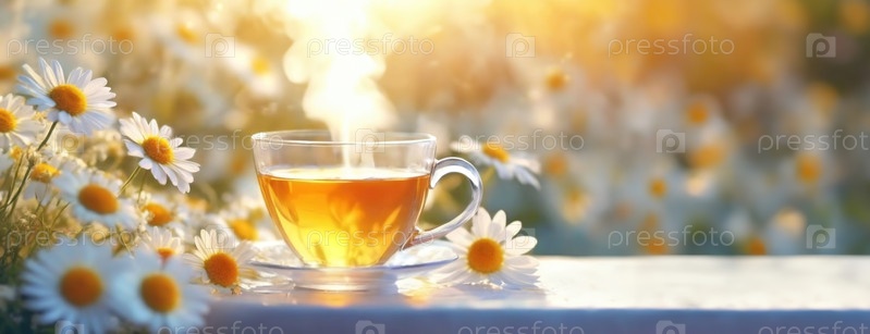 Стеклянный стакан с ромашковым чаем, освещенным мягким закатом солнца. горячий напиток среди поля изящных цветов. панорама с копировальным пространством