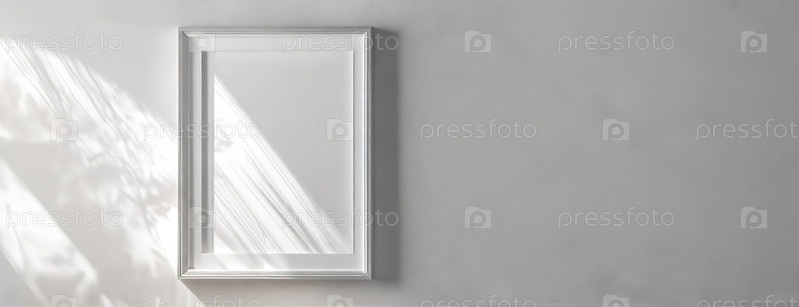 Простая рама висит на белой стене с солнечным светом, бросающим тень.Минималистская эстетика подчеркивает игру света и тени, создавая мирную и чистую композицию.Панорама с копировальным пространством