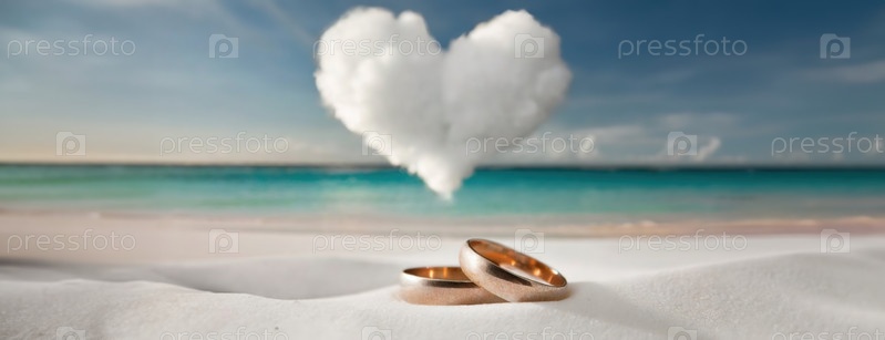 Романтическая концепция с обручальными кольцами на белом песчаном пляже и облаком сердца. Нежные морские волны с бесконечным океаническим горизонтом на заднем плане. Панорама с копировальным пространством