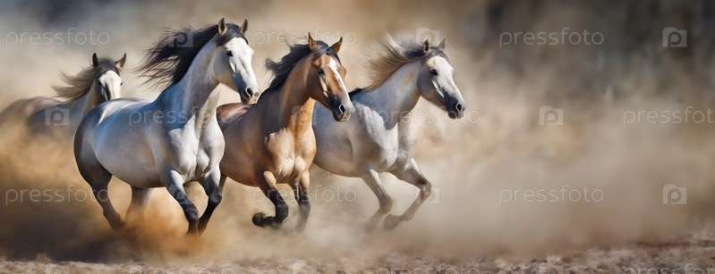 Стадо лошадей, скачущих по пыльной тропе. Динамическая сцена с несколькими конями в центре галопа, пыль поднимается из-под них, скорость, сила и свобода. Панорама с копировальным пространством