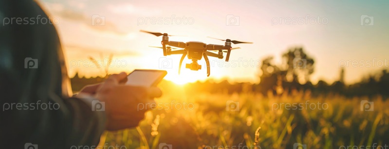 Мужчина управляет беспилотником, летящим над солнечным полем, символизирующим современное сельскохозяйственное наблюдение и мониторинг окружающей среды с использованием интеллектуальных технологий