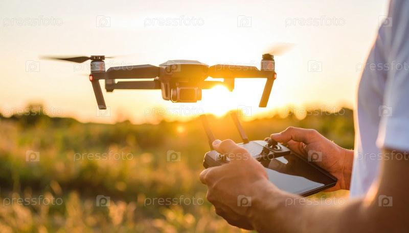 Близость человека, летающего дроном в золотой час, символизируя технологии, инновации и рекреационное или профессиональное исследование воздуха