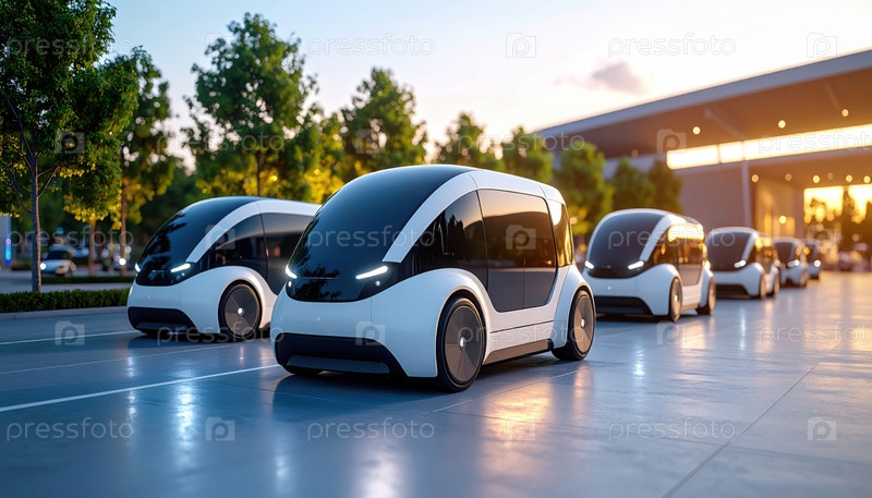 Футуристические самоуправляемые электромобили выстроились в городской среде, символизируя автоматизацию следующего поколения, устойчивость и транспорт