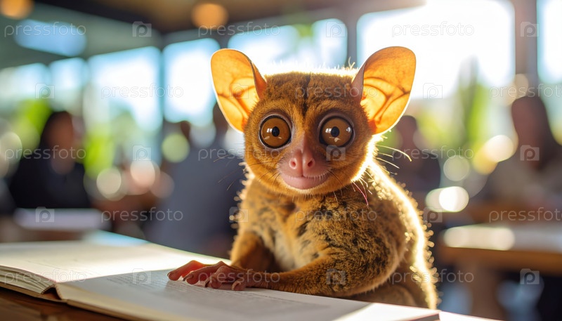 Милый примат с большими глазами, читающий книгу в уютном кафе, символизирует любопытство, образование и сочетание животных с человеческими привычками рассказывания историй