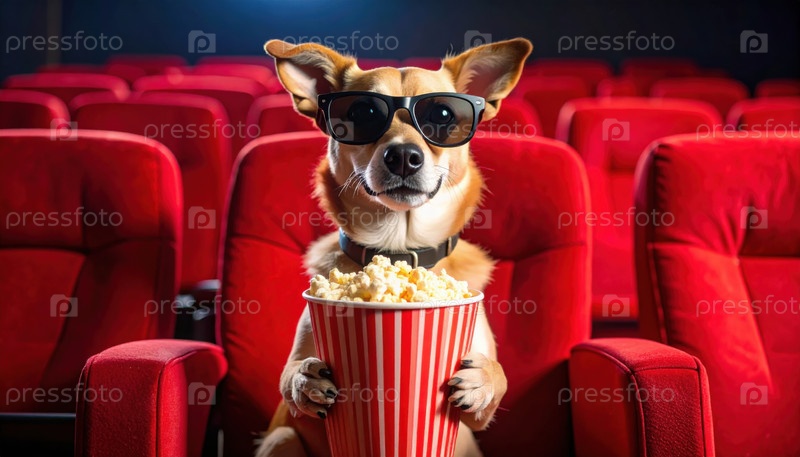 Стильная собака в солнцезащитных очках и с попкорном в кинотеатре демонстрируют смешение поп-культуры, моды на домашних животных и забавного юмора