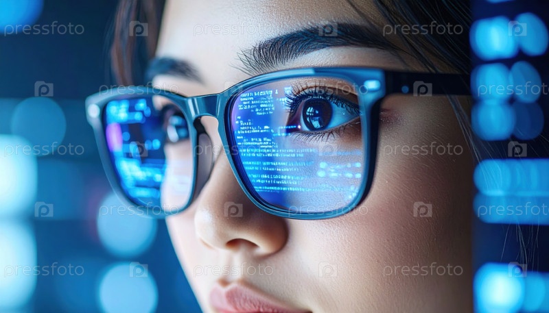 Глаз женщины отражает компьютерный код на ее очках, символизируя кибербезопасность, глубокую фокусировку, кодирование, технологическую культуру и искусственный интеллект