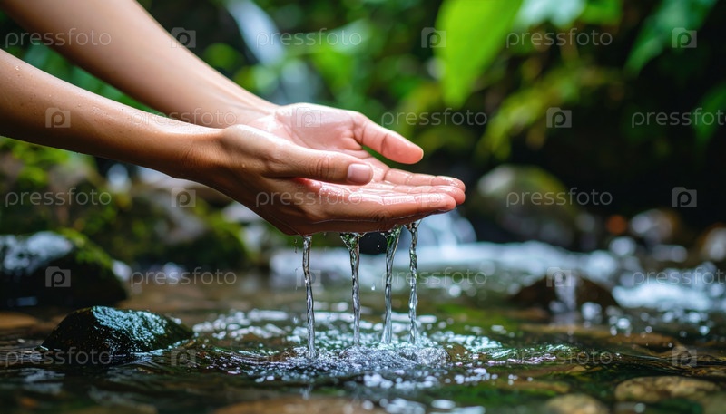 Руки собирают свежую родниковую воду из горного ручья, представляя концепции чистоты, устойчивости и сохранения природных ресурсов