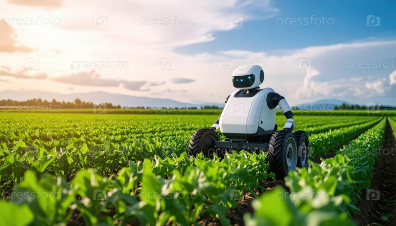 Футуристический робот, изучающий урожаи на поле, передает сельскохозяйственные технологии, устойчивость и инновации в современных методах ведения сельского хозяйства
