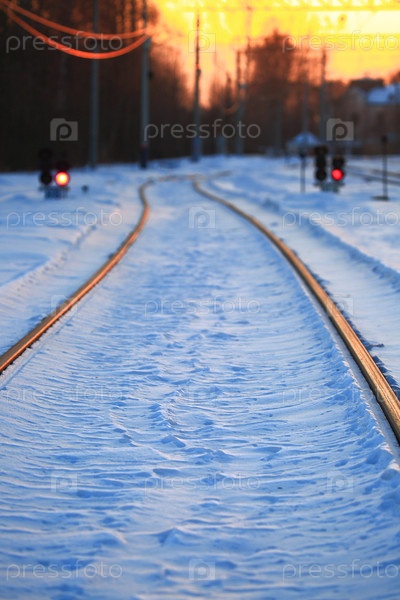 Вид вдоль покрытой снегом железной дороги зимнего вечера при закате солнца