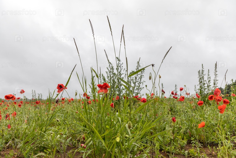 Полевые цветы маков и травы среди мрачного серого неба после дождя