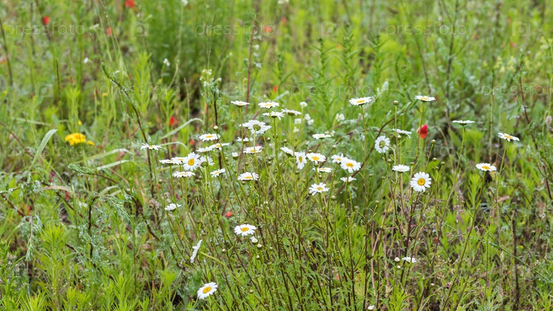 Полевые цветы ромашки и травы на поле после дождя