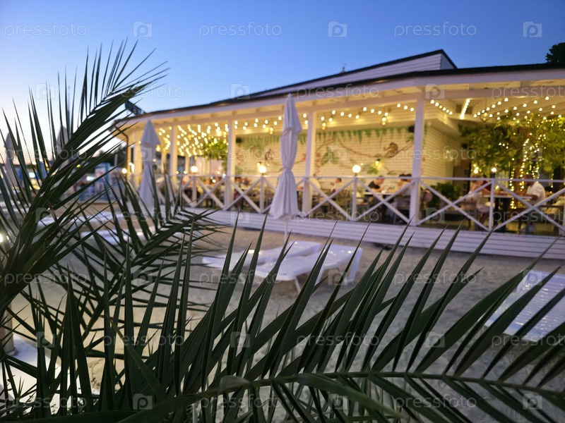 Ужин у моря: вид на ресторан через пальмовые ветви.Кухня в Сочи