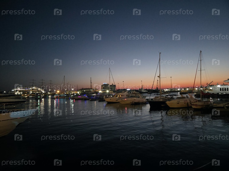 Ночная гавань - яхты, огни 'Астория' и закатное небо