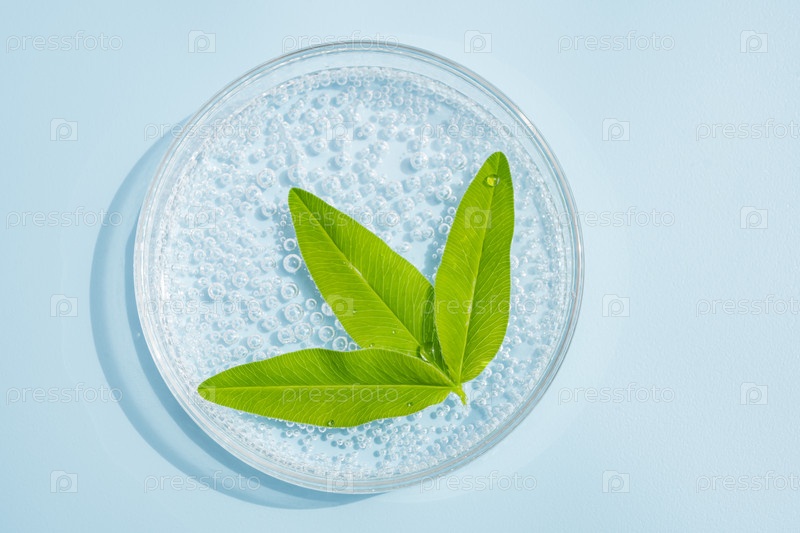 Чашка Петри с косметическим гелем и зелеными листьями. вид сверху, жидкий макияж. травы являются натуральными ингредиентами