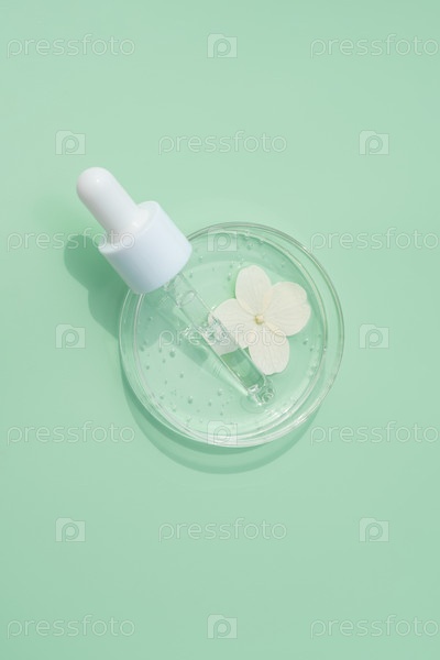 Сером косметической пипетки на чашке Петри на зеленом фоне. Концепция косметологии и фармацевтики. Кислотная шелушка, масло для лица, коллаген