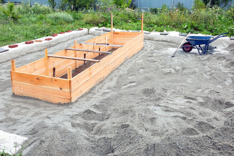 Строительная площадка с коляской и лопатой в песке