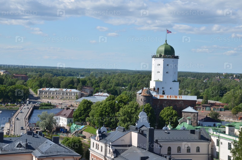 Вид на Выборгский замок, башню Святого Олафа и город Выборг с смотровой площадки часовой башни