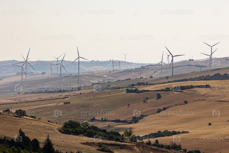 Италия. Пюлия. Ветряные электростанции на холмах с полями и деревьями. Италия. Апулия. Ветряные турбины на холмах с полями и деревьями