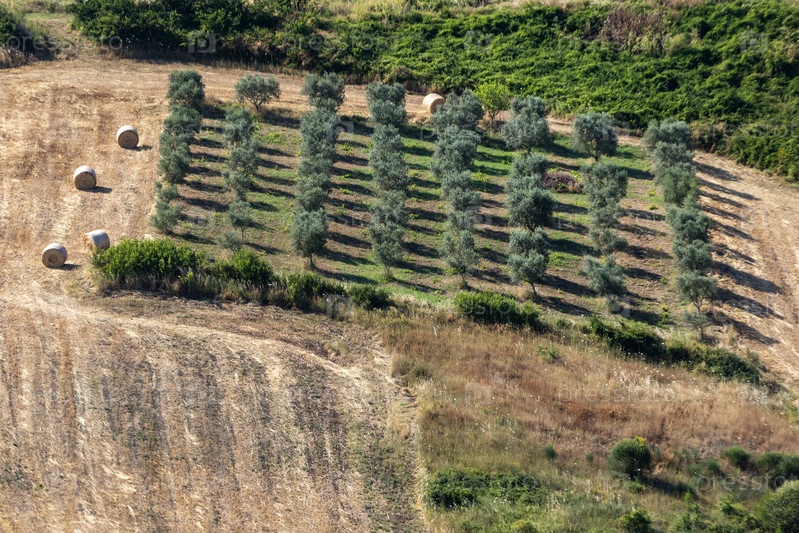 Италия.Пулия.Сеновая ручка и ряды оливковых деревьев на холмистой местности