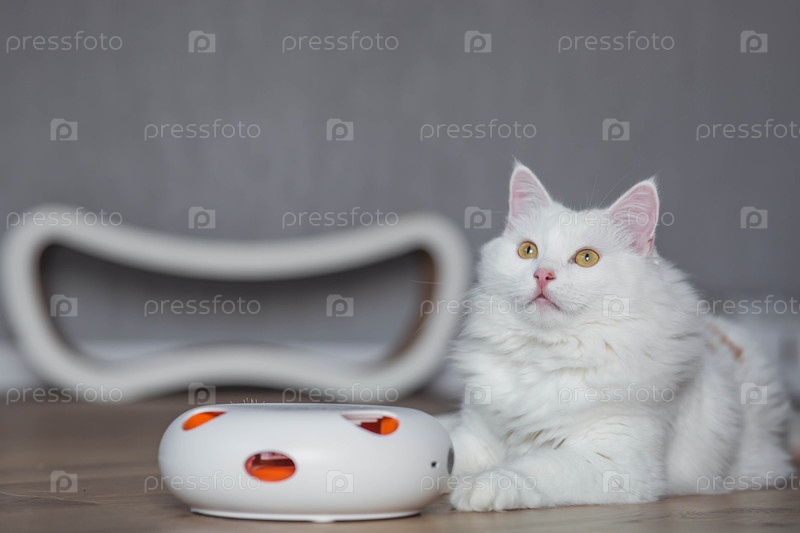 Молодой белый пушистый кот играет с электронной игрушкой. гаджеты для домашних животных. уход и обслуживание
